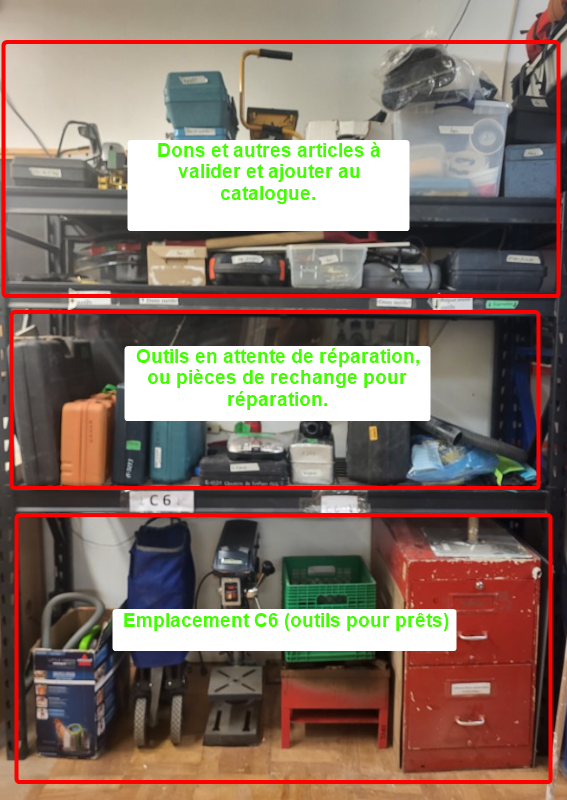 - Déposez les outils dans la boîte ou étagère explicitement identifiée à cet effet (étagère noir au fond à droite de la bibliothèque à Villeray, voir photo et établie du comité outils à Petite Patrie (photo à prendre).