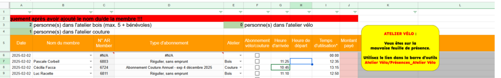 - Remplir le fichier des présences en ligne avec les informations suivantes: date, nom, heure d’arrivée et atelier utilisé (le fichier des présences s’ouvre automatiquement lorsqu’on ouvre Google chrome, il se trouve sur le Drive dans « ateliers »)